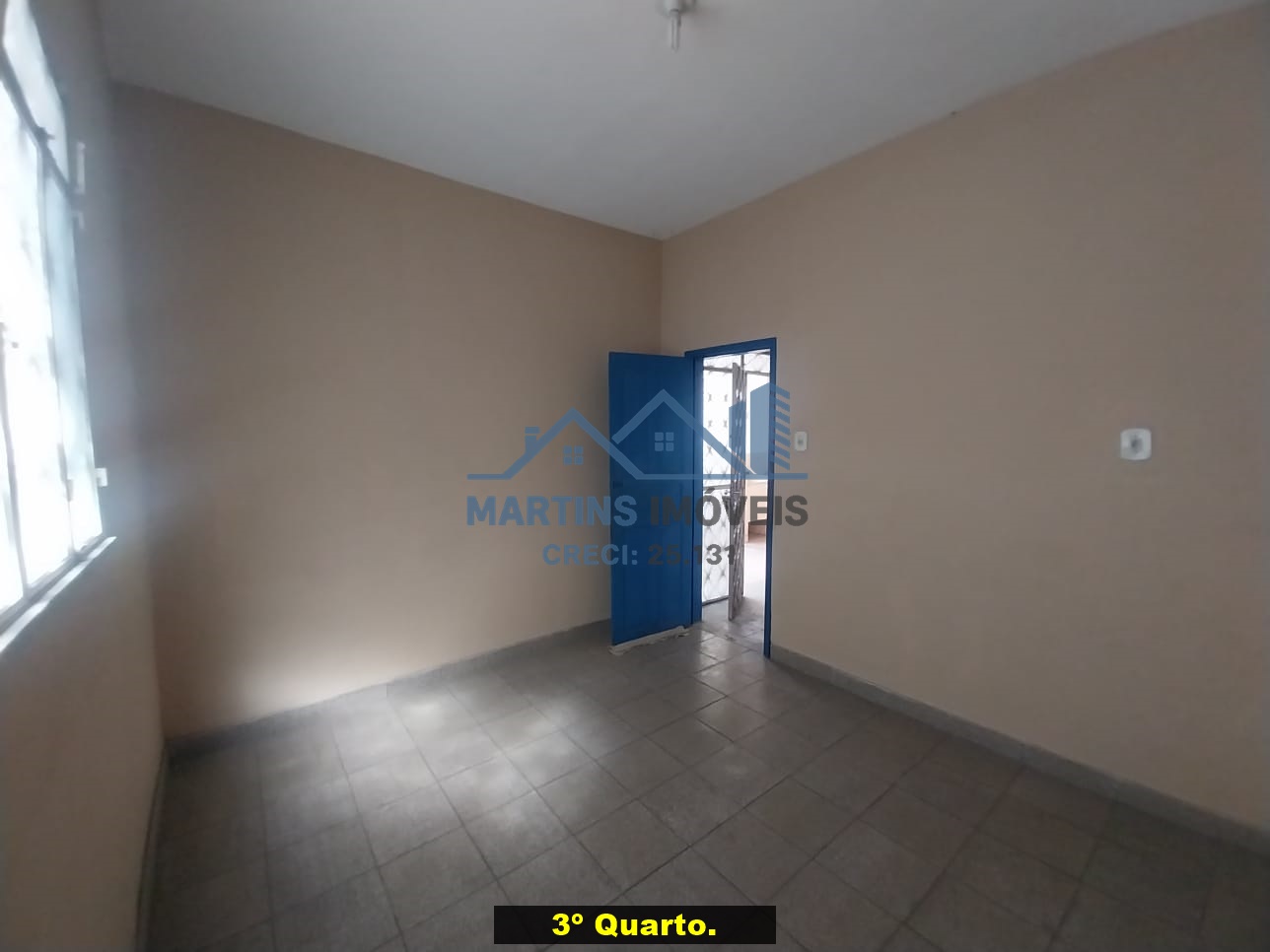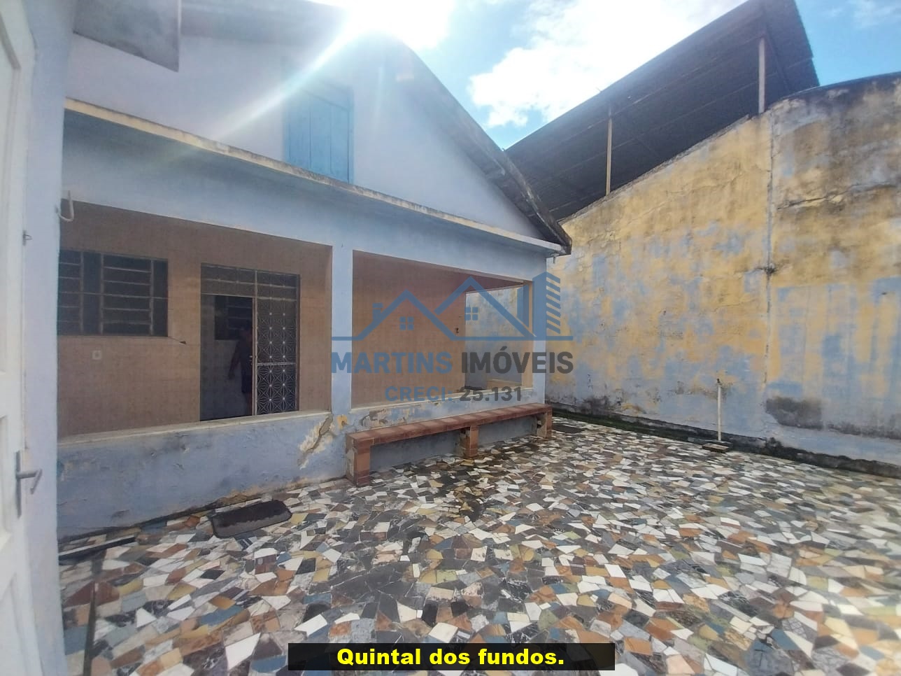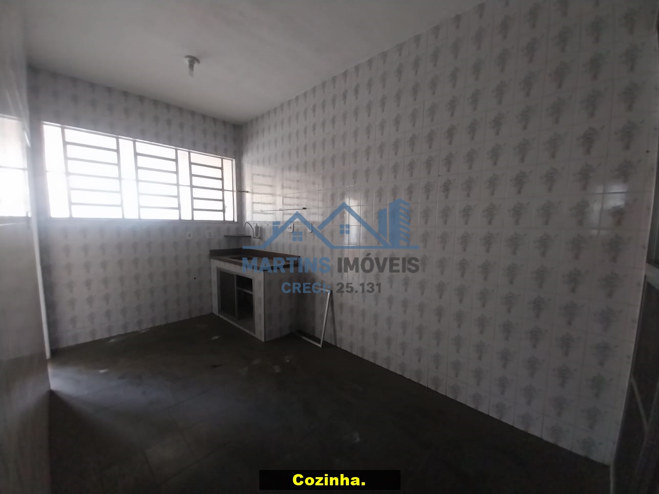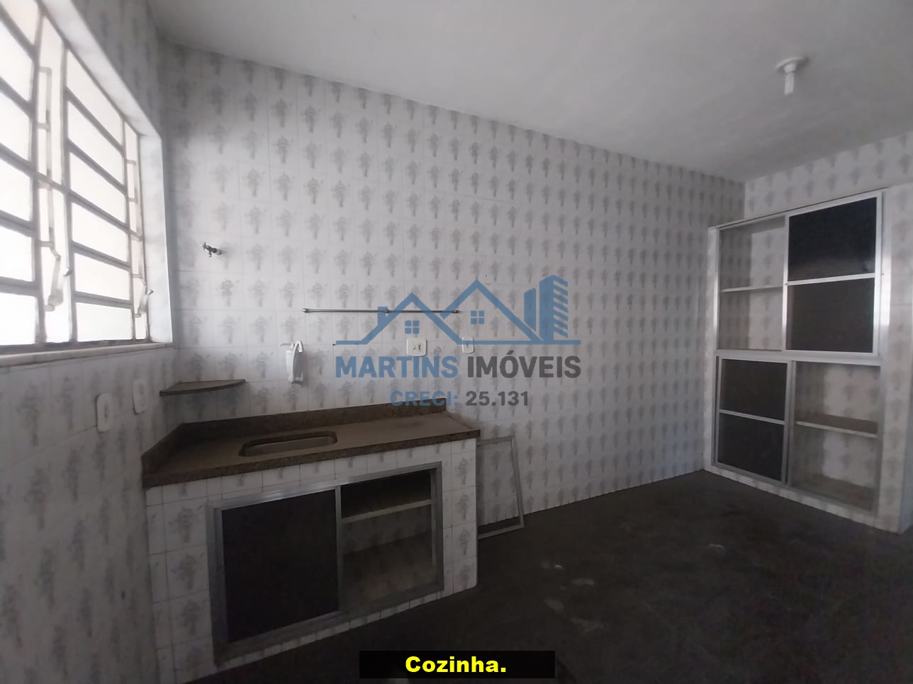Sala espaçosa alto, três quartos, ampla cozinha, banheiro social e área de serviço coberta.